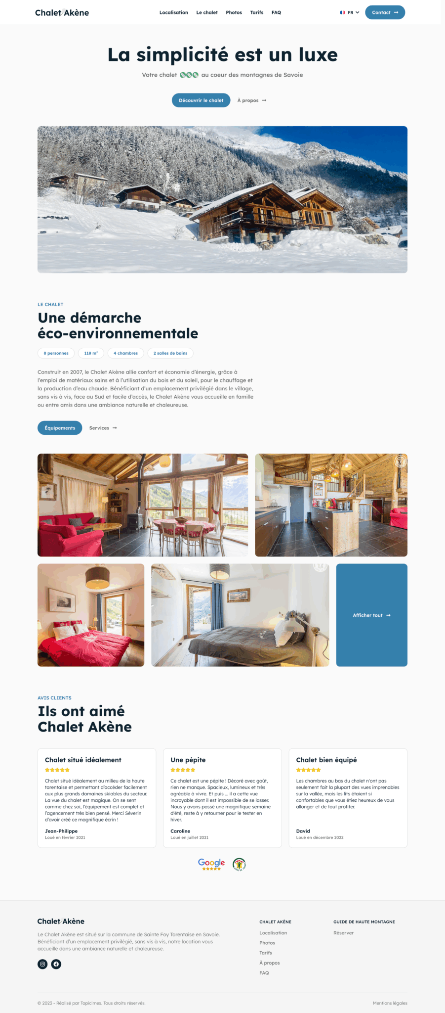 Refonte complète du site internet du Chalet Akène, un hébergement haut de gamme niché à Sainte-Foy Tarentaise.