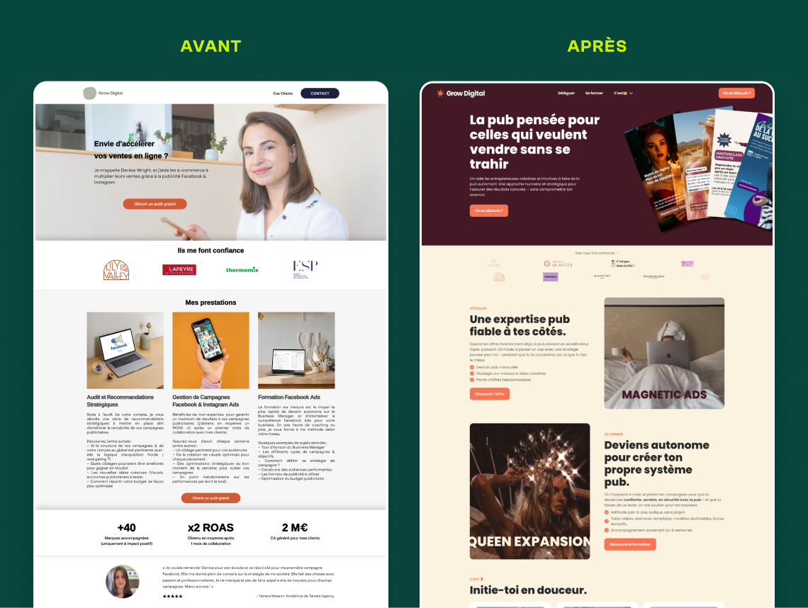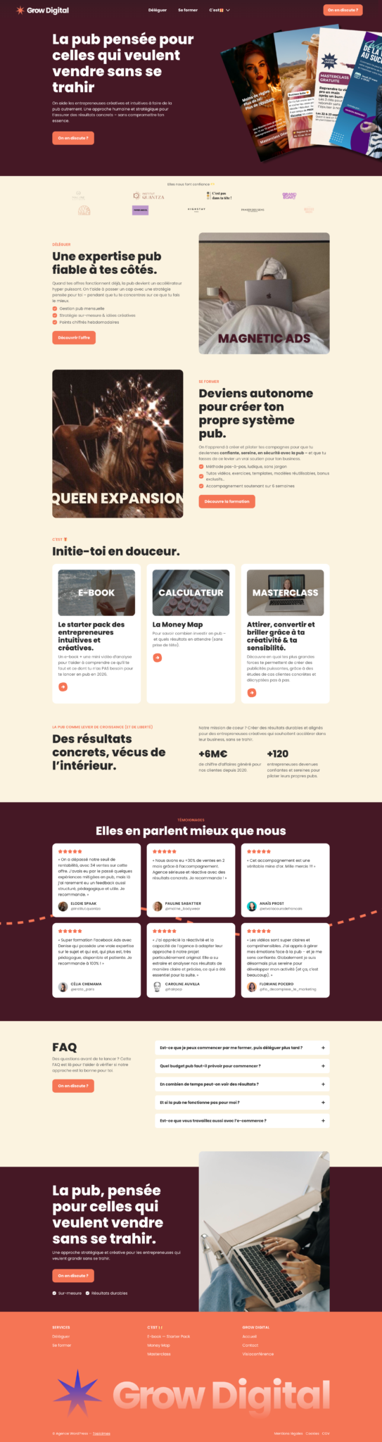 Topicimes a accompagné Grow Digital dans l’intégration complète de sa direction artistique, suivie d’une refonte totale du site sous WordPress, pensée sur une base saine et pérenne. L’intervention s’est conclue par une formation à l’intégration de contenu, permettant à l’équipe de gagner en autonomie dans la gestion et l’évolution du site.