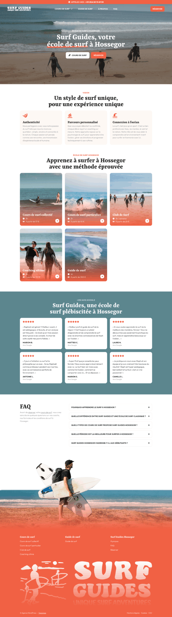 Site vitrine sur mesure pour une école de surf haut de gamme à Hossegor, fondée par Raph, moniteur diplômé et guide local.